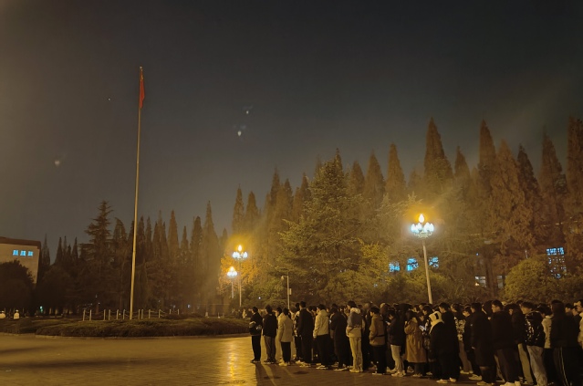 东方欲晓,在凛冽的寒风中,本次升旗仪式庄严开始。国旗队迈着整齐划一的步伐,在同学们的注目下,昂首阔步地护送着五星红旗来到升旗台前。挂旗、预备,伴随着雄壮威严的国歌,五星红旗冉冉升起。同学们齐唱国歌,注视着随风飘扬的国旗。