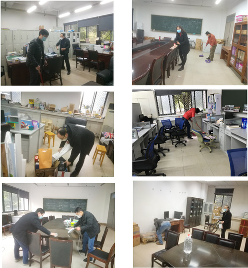 学院党委书记刘书记、院长杨伟、党委副书记方晴及副院长张均富等对学院办公室、会议室及走廊进行了全面清扫,集中清理了各卫生死角,对办公室和会议室内的座椅、空调及办公区设施设备逐一清洗、消毒,并对地面彻底清扫,喷洒消毒液。