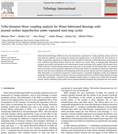近日,betway必威西汉姆联张均富教授研究团队在SCI期刊《Tribology International(JCR一区,ISSN0301-679X,近三年影响因子为6.1) 发表题为Tribo-Dynamic-Wear coupling analysis for Water-lubricated Bearings with journal surface imperfection under repeated start-stop cycles的研究论文。团队陈守安博士为论文的第一作者,法国普瓦捷大学Michel Fillon教授为共同作者,西华大学为论文的第一完成单位。