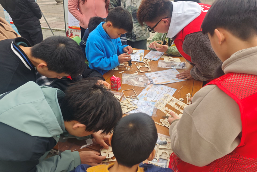 随后,志愿者们与社区儿童结成对子,开始教他们制作简易的机械作品。在志愿者的耐心指导下,孩子们充分发挥想象力和创造力,认真地动手操作,一步步地制作出属于自己的机械作品。活动现场充满了欢声笑语,孩子们在动手实践中感受到了科技的魅力和手工制作的乐趣,同时也锻炼了自己的动手能力和思维能力。