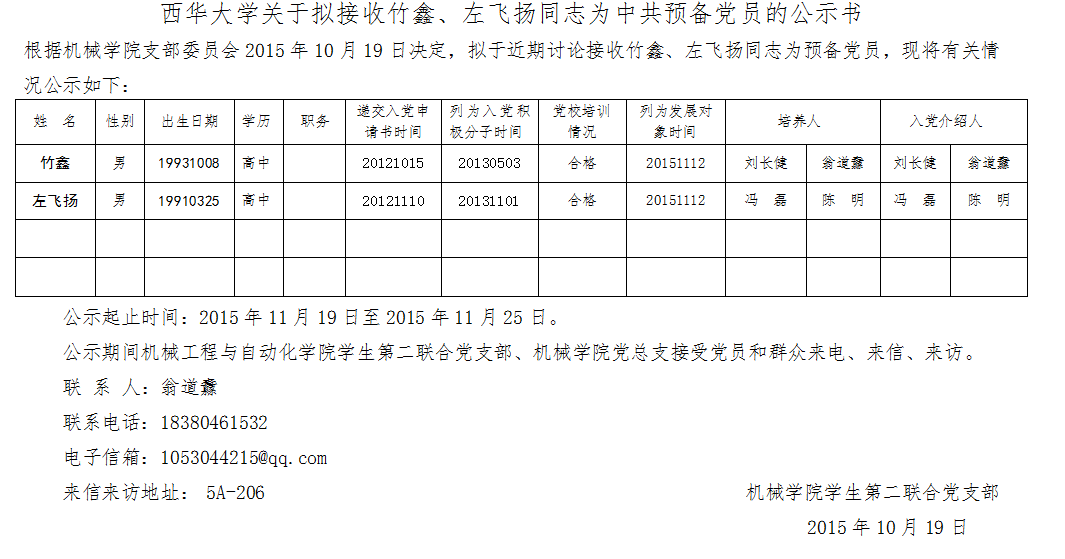【公示公告】西华大学关于拟接收竹鑫、左飞扬同志为中共预备党员的公示书