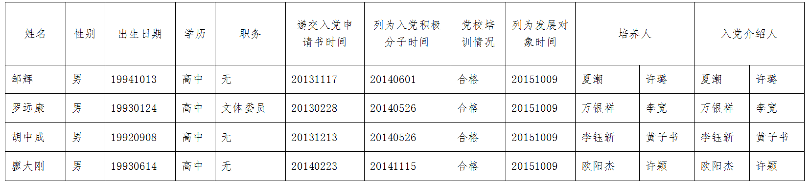 点击:251 根据机械工程学院支部委员会2015年11月 18日决定,拟于近期讨论接收邹辉、罗远康、胡中成、廖大刚同志为预备党员,现将有关情况公示如下: