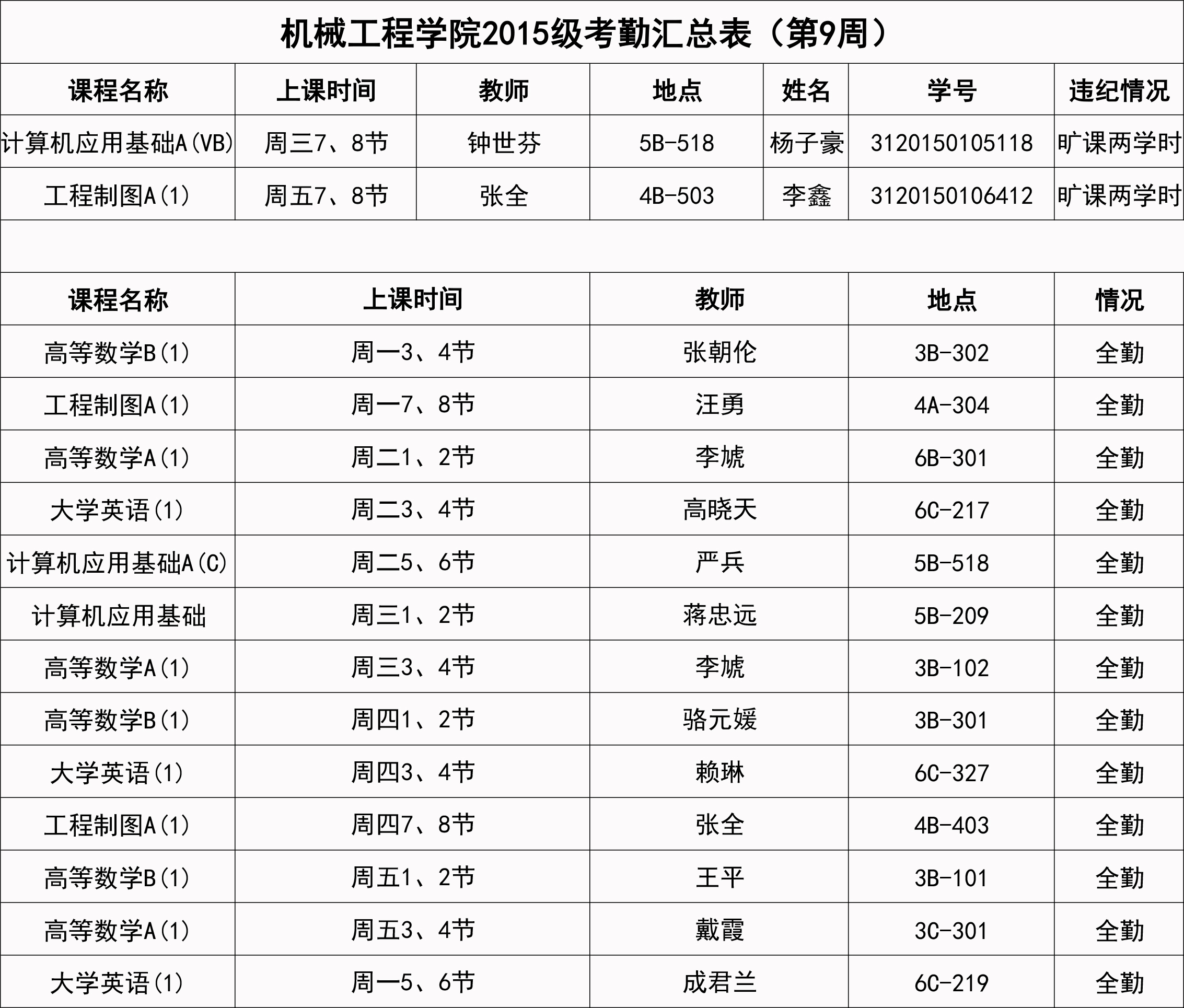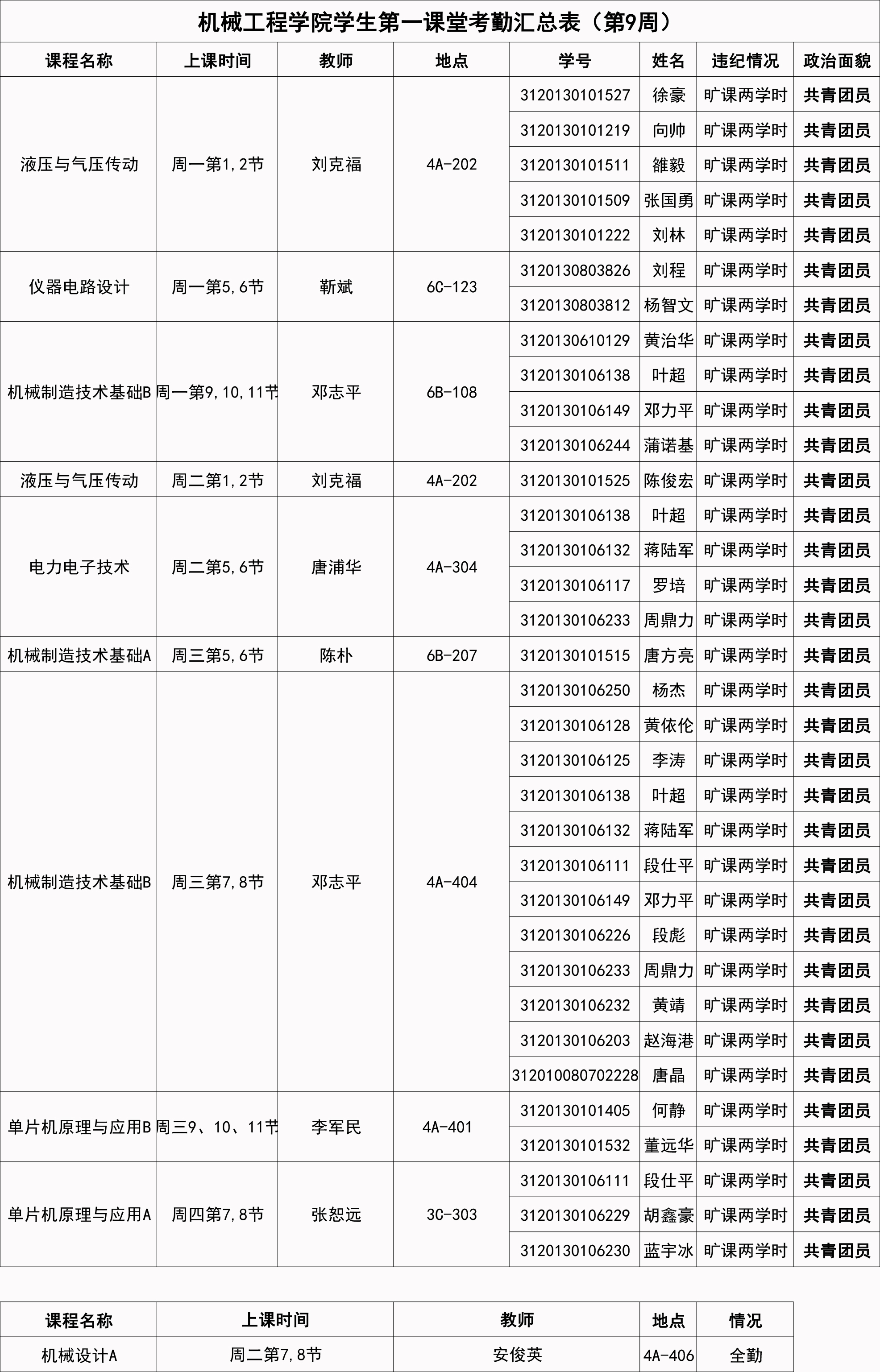【考勤公示】机械学院学生第一课堂(第9周)考勤公示