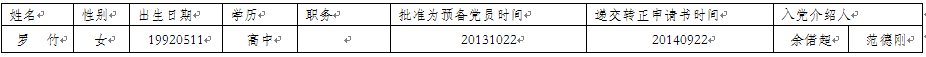 根据机械学院支部委员会2014年10月21日决定,经机械工程与自动化学院学生第二联合党支部提名,机械学院党总支审批,拟将罗竹同志转为中共正式党员,现将有关情况公示如下: