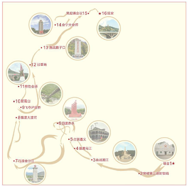 序号 | 红军长征的主要地点及最终落脚点 | 坐标X(mm) | 坐标Y(mm) |