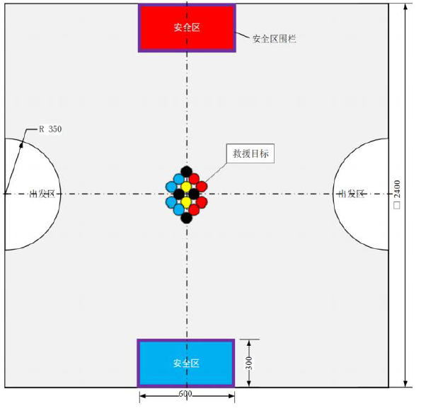 救援目标包括普通救援目标、核心救援目标和危险救援目标三种,总数量不超过40 个,救援目标可以是不同的抽象几何体(包括圆柱体、方形体、三角形、球体、锥体等),其直径不超过140mm 和重量不超过800g。普通救援目标有红色和蓝色两种,由双方各自独立完成;核心救援目标和危险救援目标为双方的公共救援目标。初赛时,救援目标均为球体,其直径约φ40mm、重约3-10g,数量14 个,其中8 个普通救援目标(红色4 个和蓝色4 个)、4 个核心救援目标(黑色),2 个危险救援目标(黄色),其权重不同。救援目标位于场地中心,摆放位置及姿态如图4所示。
