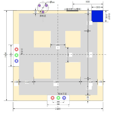 赛场尺寸为2400mm×2400mm 正方形平面区域,赛场周围设有一定高度的挡板,仅作为场地边界标识(颜色和高度不做任何要求),不宜作为寻边、定位等其它任何用途,如图3所示。