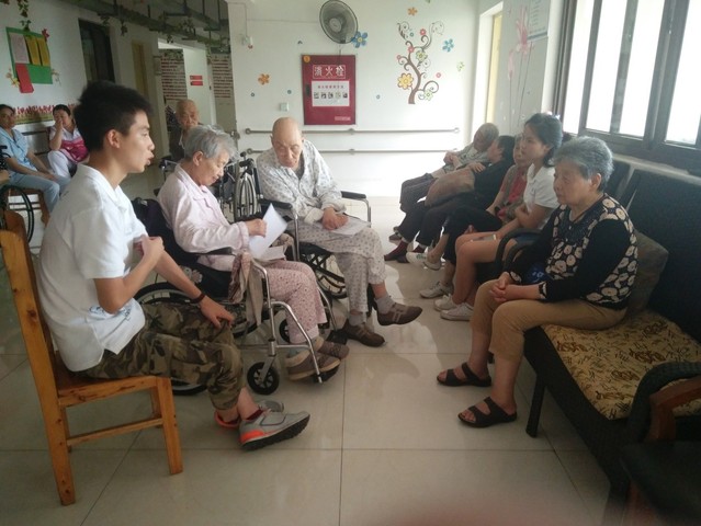 上午10时,火热的骄阳炙烤着大地,高温天气依然消灭不了志愿者的热情,他们抵达美好明天敬老院后,敬老院负责人热情的接待了大家,并给大家介绍了敬老院的基本情况。随后,队长为了更好的展开志愿服务活动将大家分为3个组,3人编为一组,同学们通过与老人聊天,唱歌等方式走进老人。