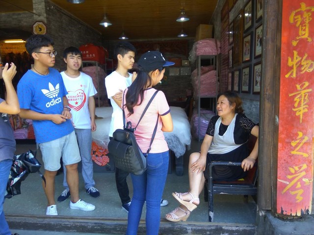同学们在调研蚕丝被老字号负责人蚕丝被的相关问题,负责人为同学们细心解答。同学们就蚕丝被的历史,制作流程,以及销售等方面进行了细致的询问,并做了详细的记录。