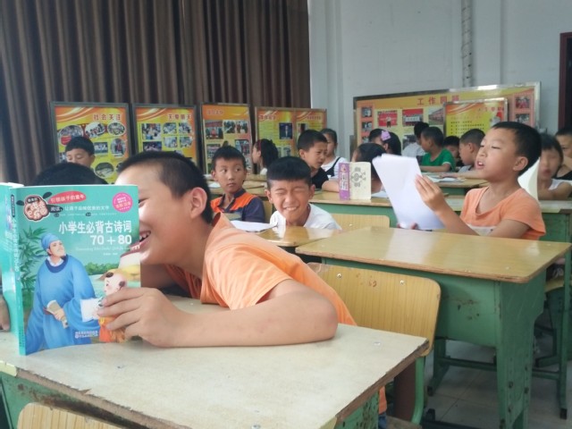 在上午的课堂上,三下乡小分队的同学首先让小朋友们一起温习了这三天以来学过的古诗,并进行了背诵,小朋友们读起书来琅琅上口,对知识充满了期待与渴望。随后小朋友们学唱了歌曲虫儿飞,并且勇于上台以合唱或独唱的方式向大家进行了展示,瞬间带动了现场的气氛。