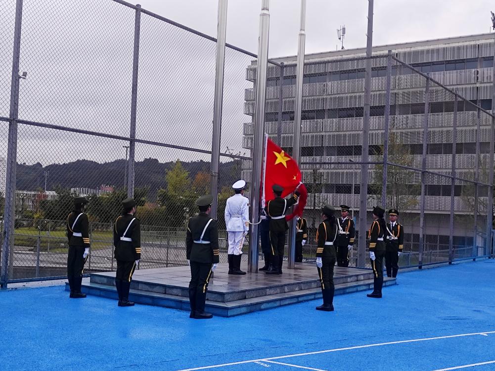 晨光熹微,秋风送爽,伴随着清新的空气与朝阳初升,国旗护卫队迈着整齐有力的步伐,护送鲜艳的五星红旗来到旗杆下。在庄严的国歌声中,全体师生肃立注目,五星红旗冉冉升起,迎风飘扬。