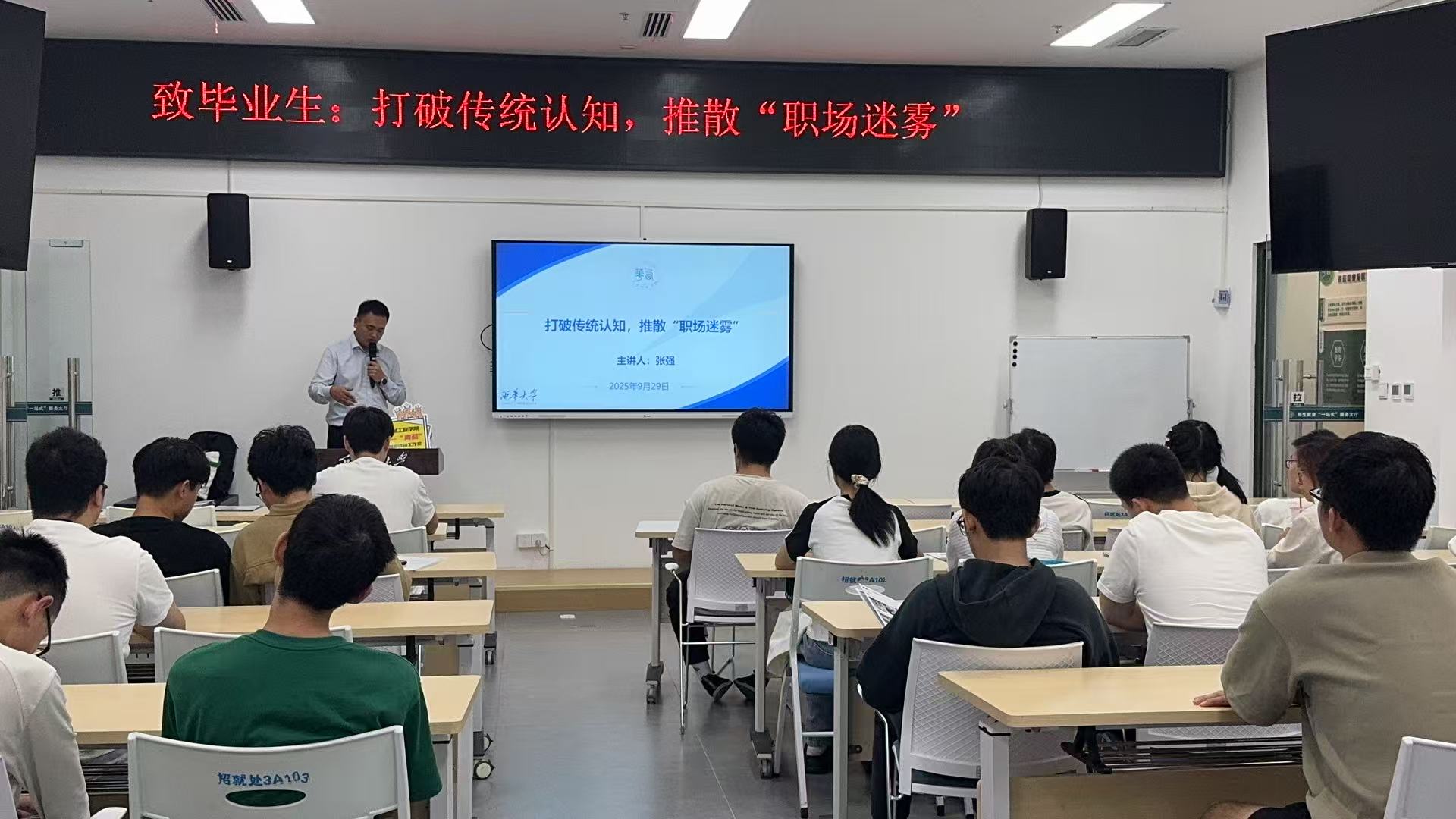 9月29日下午,学院“机育-青蓝”职业规划与就业指导工作室精准对接2026届毕业生就业需求,特别邀请2009届毕业校友张强重返母校,在郫都校区5ST426报告厅开展就业指导与职业生涯规划专题讲座。近百名学子到场聆听,共同探寻职场发展新路径。