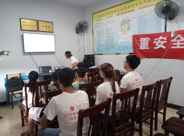 在简单安排布置之后,室内的班会就开始了。首先志愿者李新宇同学为小朋友精心准备了科技知识竞赛,与小朋友越来越加的熟络,孩子们积极踊跃地回答着一个又一个的问题,相互分享着得到奖品的喜悦。志愿者对于每一个小知识进行耐心得讲解,给予他们一些生活常识。随后,志愿者舒伟和伍卉同学为了丰富石楼乡留守儿童的课余生活,给孩子们准备了画笔和画纸,并教他们画一些简单的小事物,孩子们的画笔下是对生活的期望,他们的眼里充满了对知识的渴望,一同和志愿者完成了一幅又一幅的图画。最后,志愿者伍卉带领小朋友齐唱《让我们荡起双桨》,一句句稚嫩的童声,回荡在活动室里,孩子们笑着,挥动着小手,感受这短暂开心温暖的瞬间。五岁的罗陈妹小同学主动给大家表演节目,让在场的家长和志愿者泪目。这大概是骄阳烈日下带给志愿者最大的温暖。