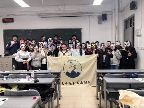 活动分为“情绪破冰”与“面具疗愈”两大环节。活动开始,首先带领大家进行“情绪温度计”小游戏,用颜色标注一周心情,迅速拉近彼此距离;随后,刀画协会成员示范基础构图与色彩搭配,引导同学们把“焦虑、期待、快乐”等抽象情绪转译成线条与色块。有人以机械齿轮为灵感,将硬朗的金属元素融入柔和脸谱;有人用渐变暖色覆盖整张面具,寓意“让情绪升温”。创作过程中,协会成员提醒同学们关注笔触节奏与呼吸频率,借绘画实现减压放松。经过一个半小时的精心绘制,一件件“情绪面具”跃然桌上,大家手捧作品合影留念。