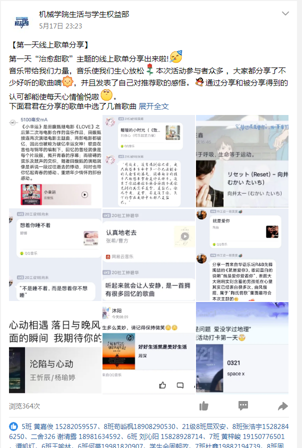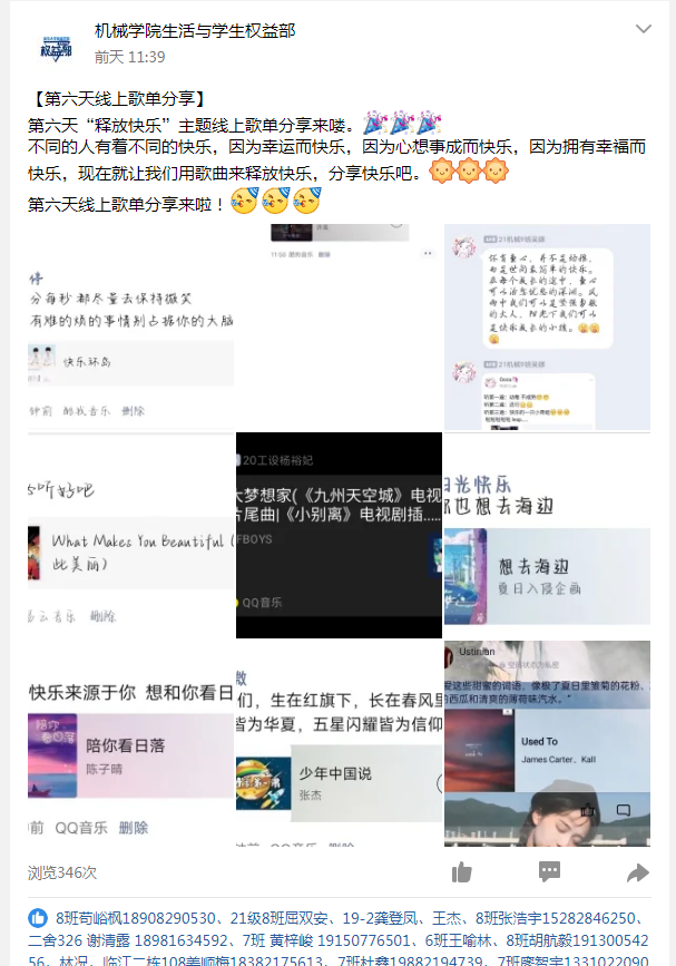 本次活动共分为:治愈甜歌,舒缓疲惫,浪漫主义,慵懒舒服,享受独处,释放快乐与超燃热曲七个不同的主题,活动期间,参与活动的同学根据当天活动的主题在活动群或是自己的朋友圈附上分享理由进行歌单分享,通过线上歌单的分享,传递温暖,传递力量。活动结束当天,评审小组会根据分享理由是否充足,感悟是否深刻,是否传递出正能量等多个维度评选出对应主题的优秀歌单,并通过官Q和推文展出。