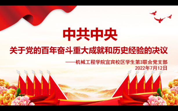 点击:150 欲知大道,必先学史。为全面贯彻习近平新时代中国特色社会主义思想,大力弘扬伟大建党精神,增强支部党员主动学习党史、听党指挥、为人民服务的意识,7月13日下午,betway必威西汉姆联宜宾校区学生第3联合党支部通过腾讯会议开展了学习“关于党的百年奋斗重大成就和历史经验的决议”的线上讲座,支部49名学生党员和17名入党积极分子参加此次讲座,会议由支部书记周岐燃老师主持,betway必威西汉姆联党委副书记李强同志参加此次讲座。