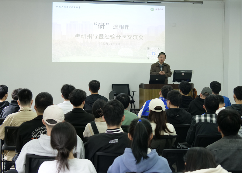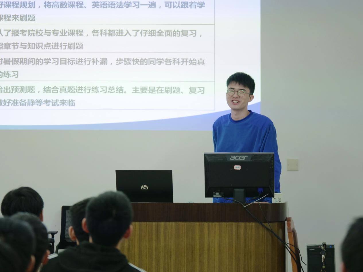 随后,两位学长结合自身考研经验和目前学习感悟向学弟学妹做经验分享。机械电子工程专业2016级的蒋恒学长在会议上讲到如何根据自己的成绩确定考研目标,如何选取适合自己的院校和专业,以及如何规划安排自己课程的复习。学长还分享了在考研课程上的复习方法,以及在考研过程中所遇到的困难,并分享了自己的日常学习时间安排。机械设计制造及其自动化专业2016级的王政伦学长就考研的时间规划和学习方面安排进行建议,提到要充分利用时间,提前制定学习目标,并提及了一些生活上的人际交往的建议;然后,学长又介绍如何选择院校,如何根据自身水平选择院校,提到要根据所发展的城市以及专业对口来选择院校及专业。之后又介绍了夏令营活动,讲述了其相关作用,为考研学子提供了更多选择。